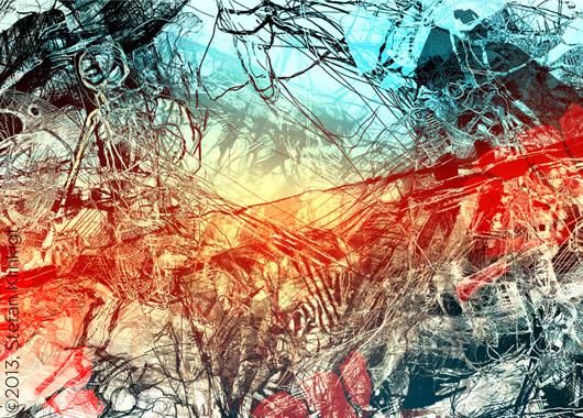 In solchen offenen dynamischen Systemen entstehen nicht selten durch innere Rückkopplungsschleifen selbstorganisierende neue Ordnungsprinzipien. Derartig komplizierte Vorgänge zu begreifen und dies mit meiner individuellen Bildsprache zu visualisieren, sehe ich als Gegenstand meiner künstlerischen Arbeit an. |